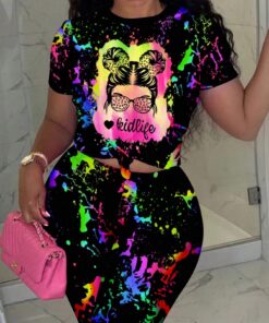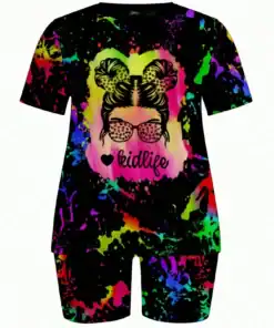 Slaydiva 2pcs Set Women’s Casual Neon Colorful Tie Dye & Portrait Printed Matching Top And Shorts For Summer