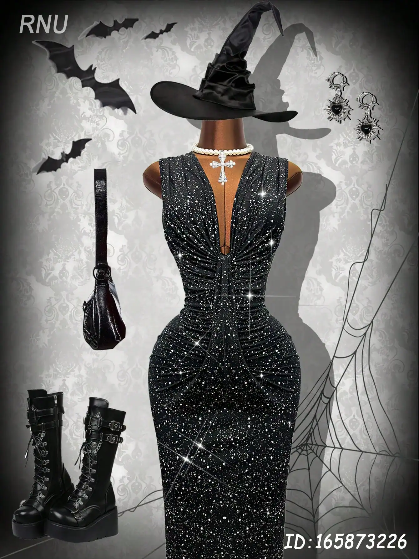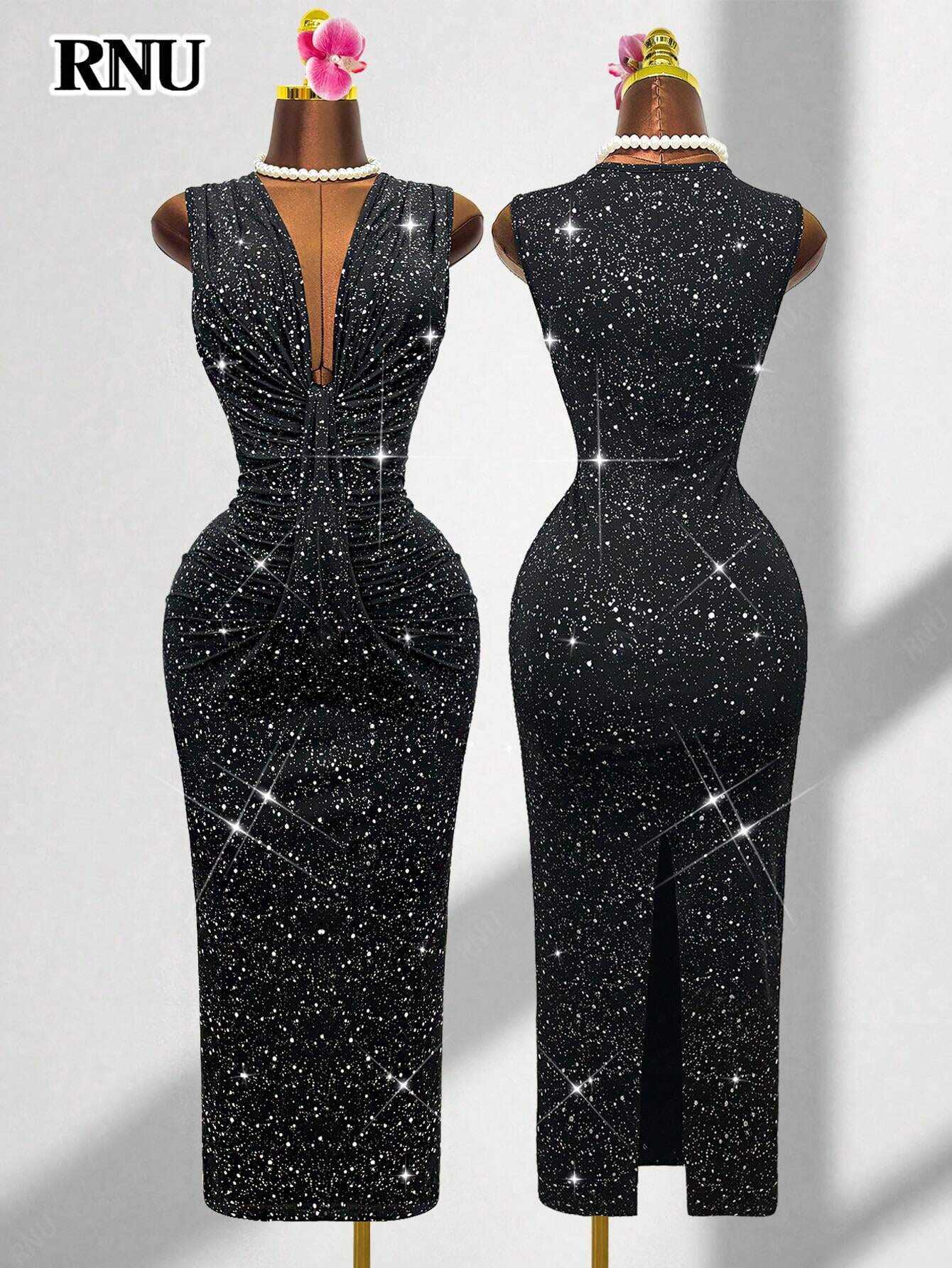 SHEIN RNU Women's Sexy Black Shiny Fabric Dress